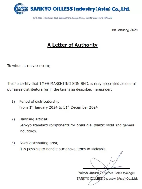 As the exclusive distributor for Sankyo Oiless in Malaysia, TMEH Group of Companies is proud to offer a comprehensive range of high-quality, reliable mould and die components. Sankyo Oiless is renowned for its innovative technology and superior products that cater to the demanding needs of the metal stamping and plastic injection industries.